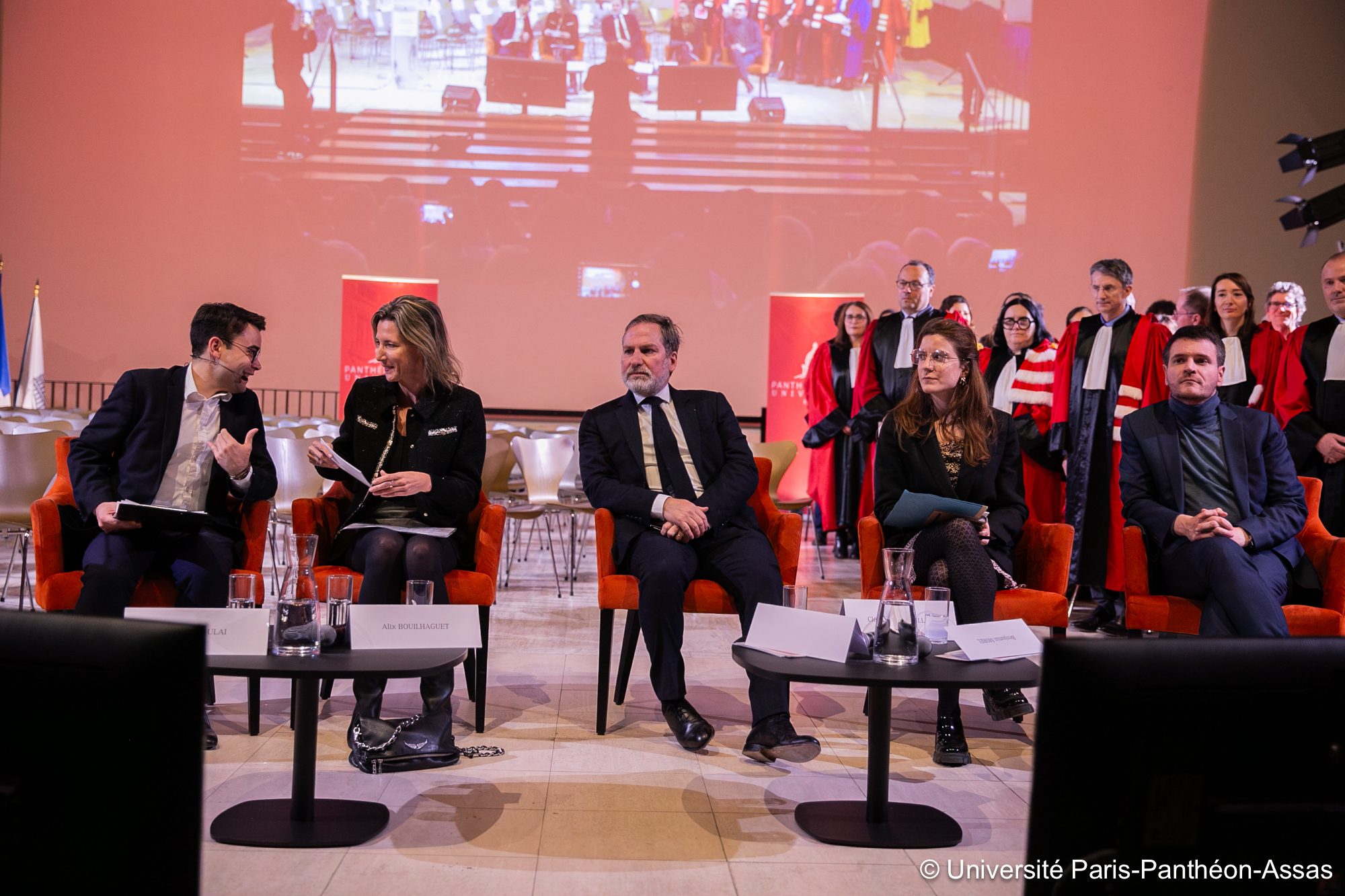 La cérémonie s'est ensuite poursuivie avec une table ronde sur le thème « l’État de droit en question dans un monde en transition », offrant ainsi une réflexion qui fait écho aux disciplines de l’université et aux enjeux du monde actuel. Menée par Julien AZOULAI, alumni 2024, diplômé du master Journalisme à l' Institut français de Presse (IFP), rédacteur en chef adjoint à TF1/LCI, et chargé de TD à l’IFP, cette table ronde a regroupé des alumni d’horizons divers :